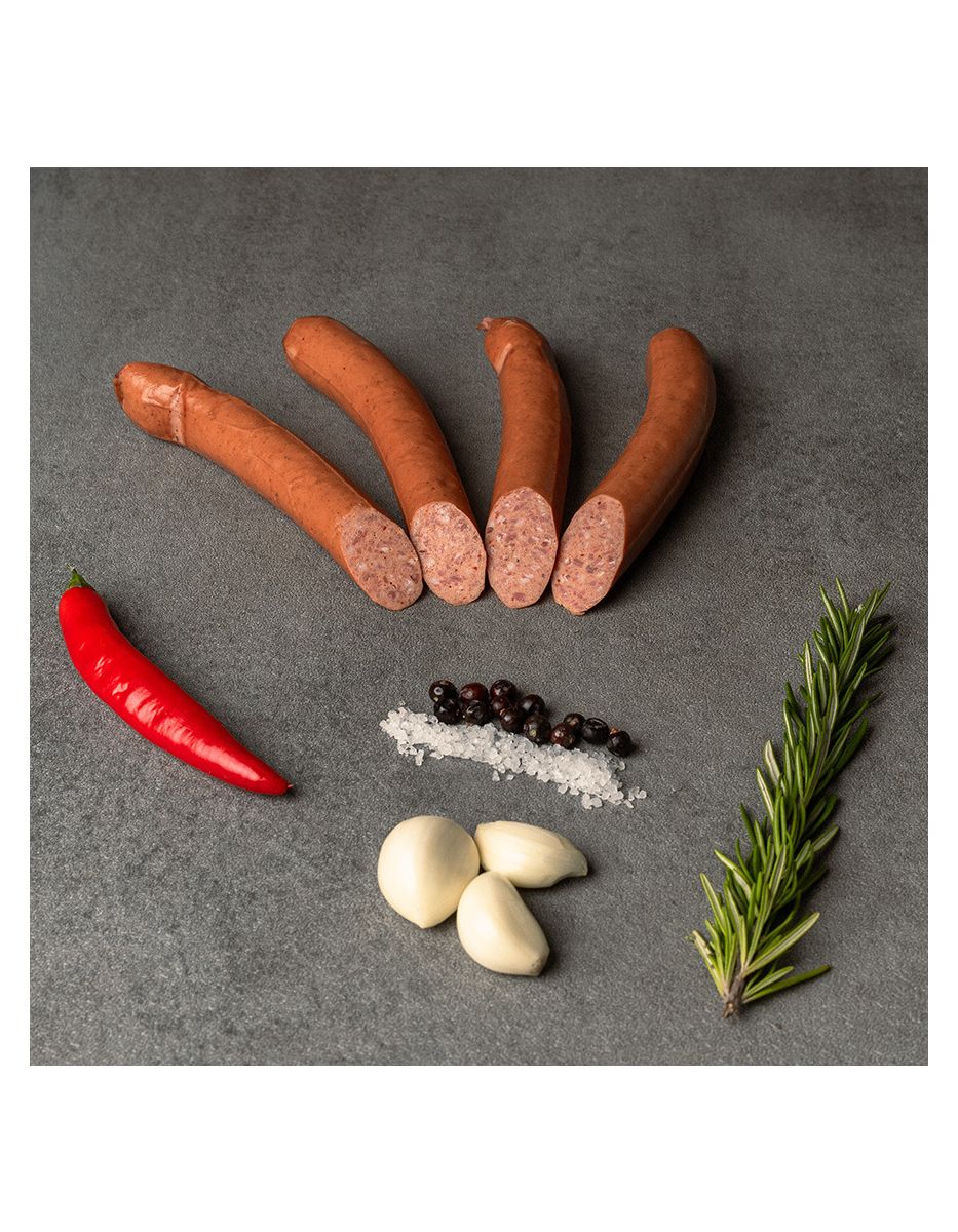Rindfleisch 77%, Rinderfett, Trinkwasser, Hochwertiges Rapsöl, Meersalz mit Nitrit, Zucker, Diphosphate, Triphosphate, Würze, Gewürze, Gewürzextrakte, Dextrose, Vitamin C, natürliches Aroma, Glucosesirup, Würze, Naturdarm, Rauch