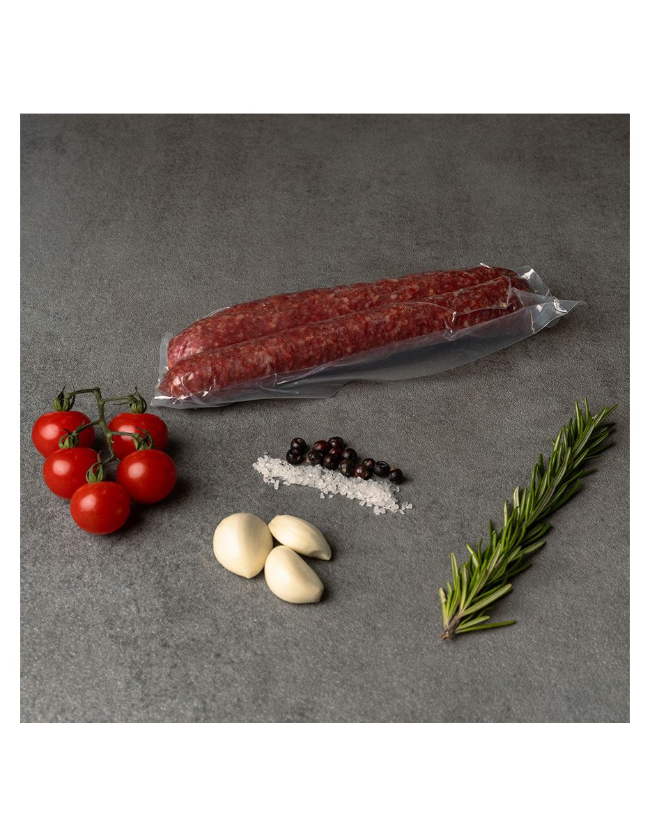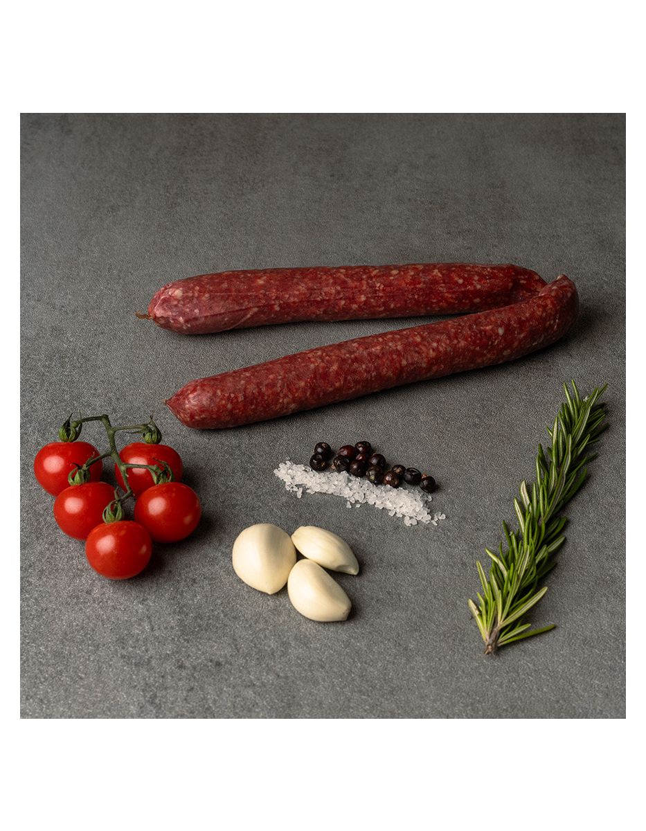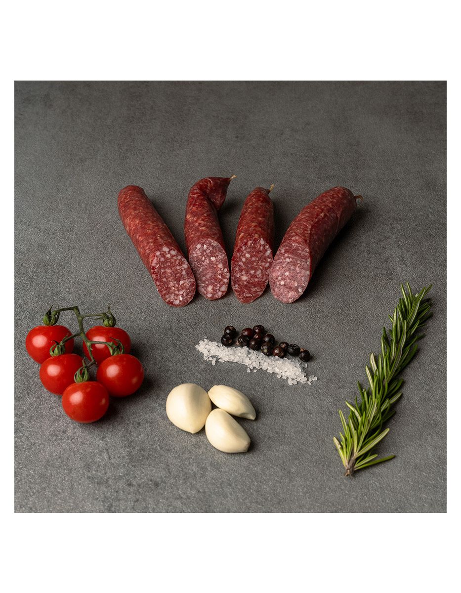 Ochsenfleisch 90%, 7% Rotwein (enthält SULFITE), Meersalz mit Nitrit, Gewürze, Dextrose, Gewürzextrakte, Würze, Vitamin C, Schweinedarm