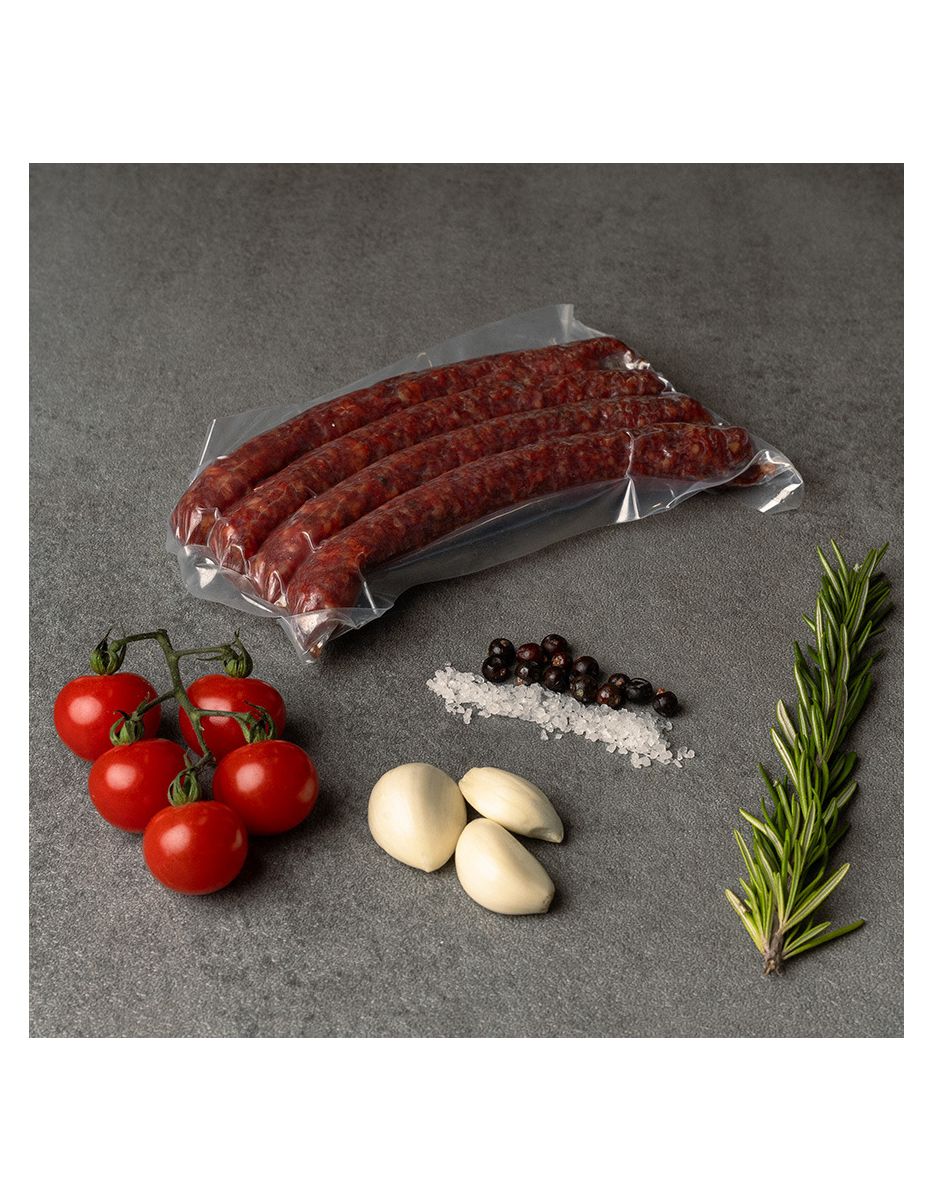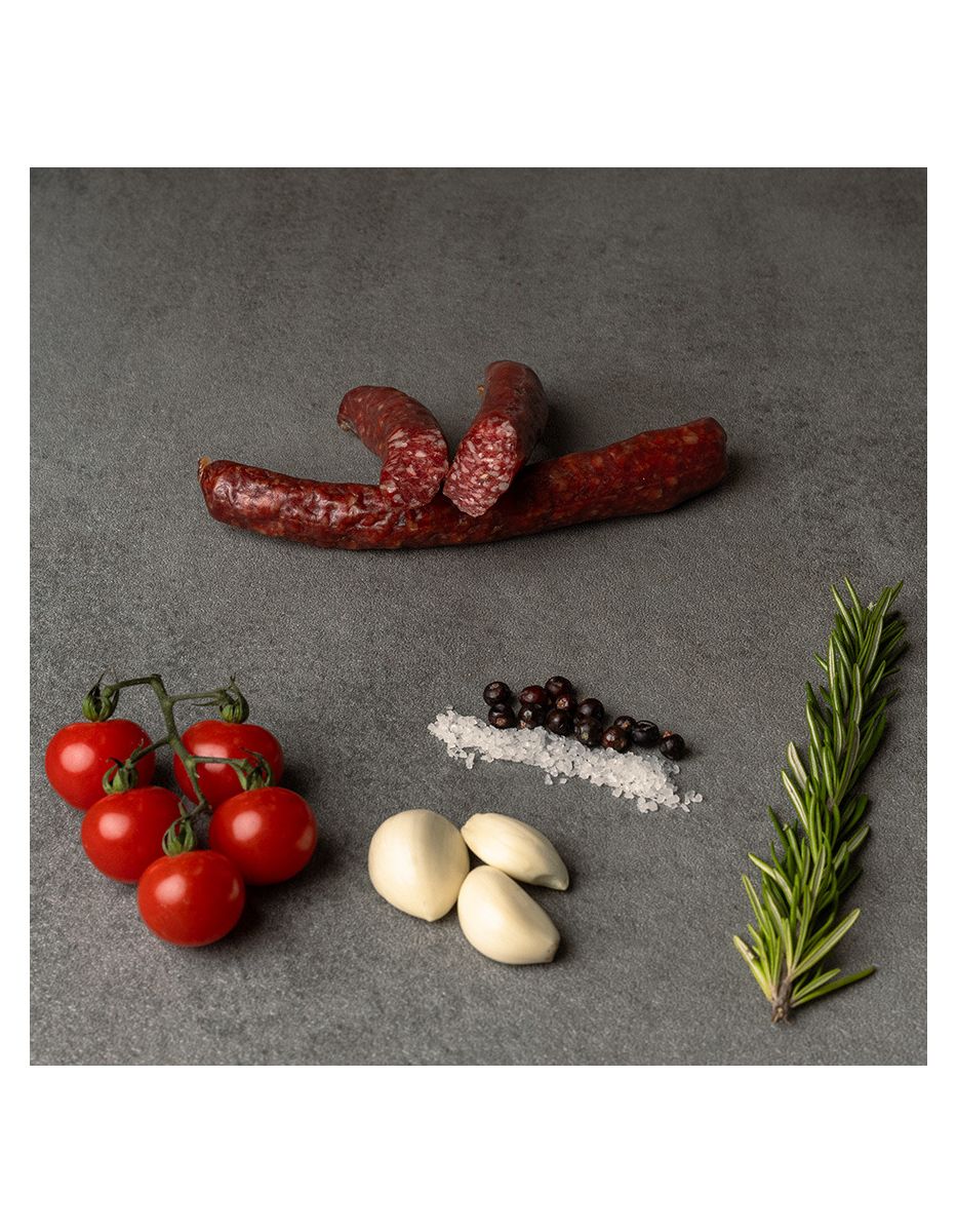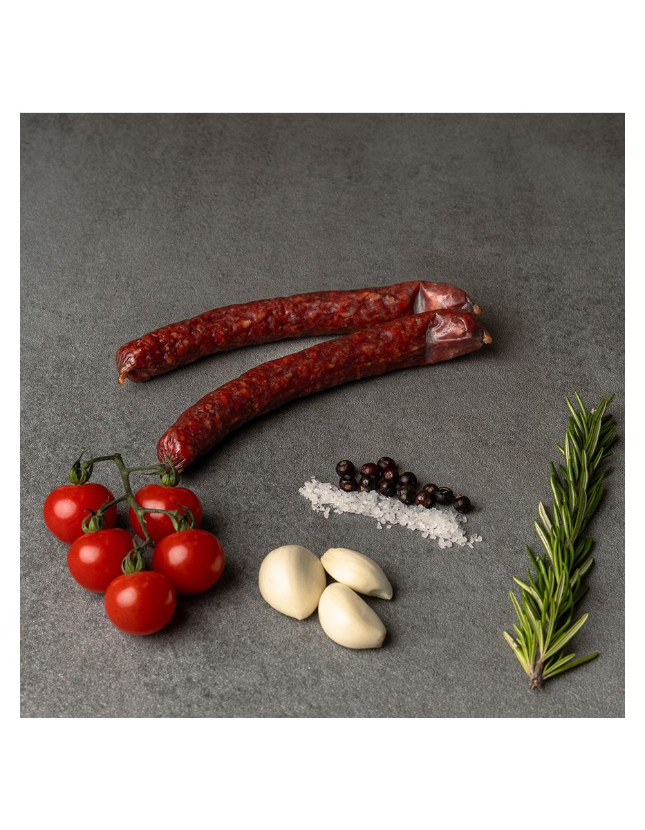 Rindfleisch 97%, Meersalz mit Nitrit, Gewürze, Zucker, Dextrose, Vitamin C, Natriumascorbat, Starterkulturen, Rauch