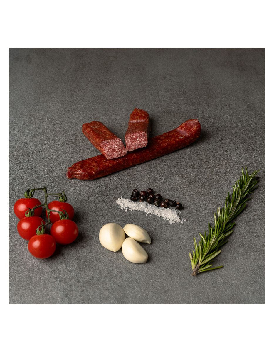 Rindfleisch 96%, Meersalz mit Nitrit, Gewürze (SENF), Würze, Gewürzextrakte, Dextrose, Starterkulturen, Darm, Rauch